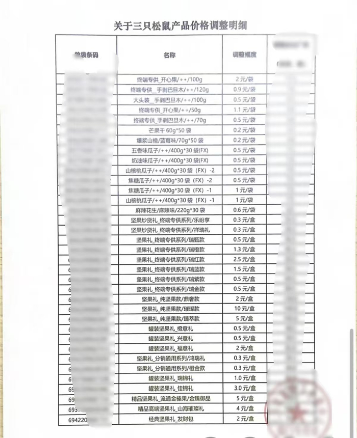 一位山东地区的经销商告诉红星资本局:“最近(供货)价格已经涨了。”红星资本局从一份价格调整通知函获悉,本轮供货价调整涉及三只松鼠的多款坚果、炒货、果干产品,包括袋装巴旦木、芒果干、瓜子,罐装坚果礼、精品坚果礼等,涨价幅度从0.2元至10元不等。