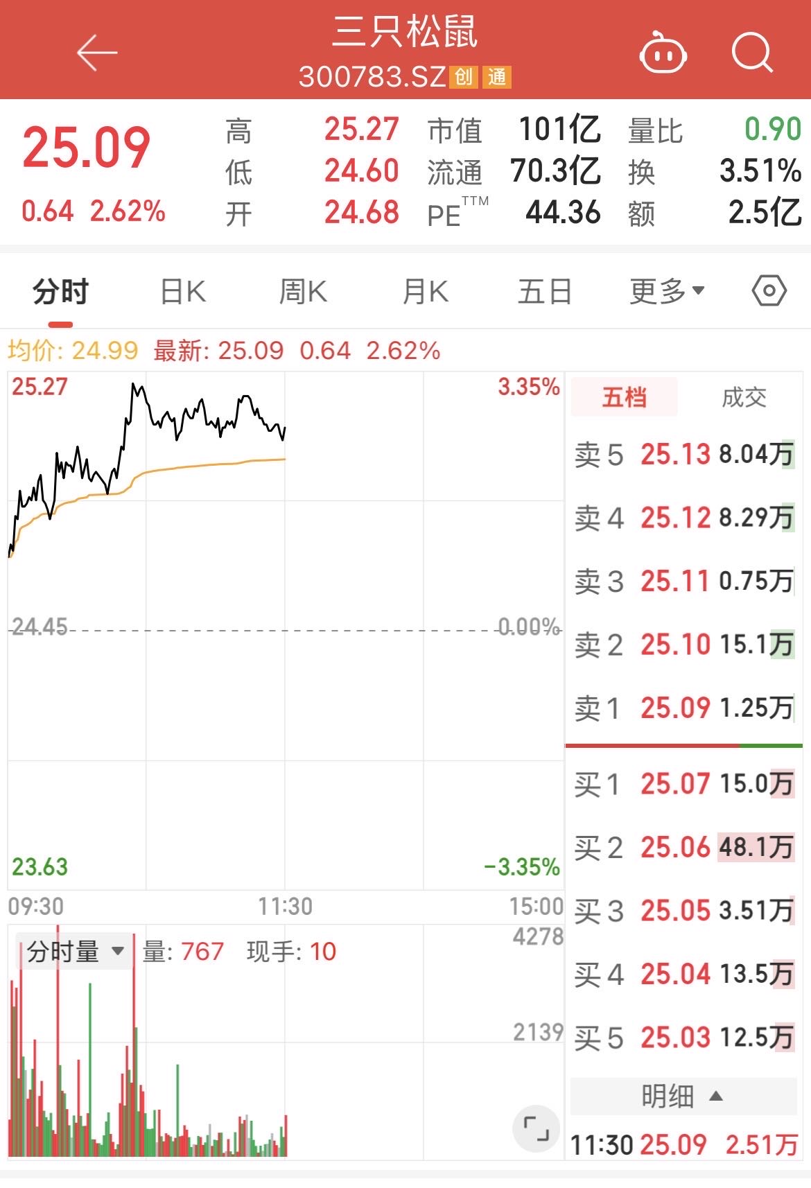截至1月19日午盘,三只松鼠报25.09元/股,涨幅达2.62%。