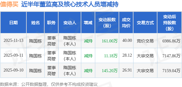 值得买:11月13日高管隋国栋减持股份合计161万股