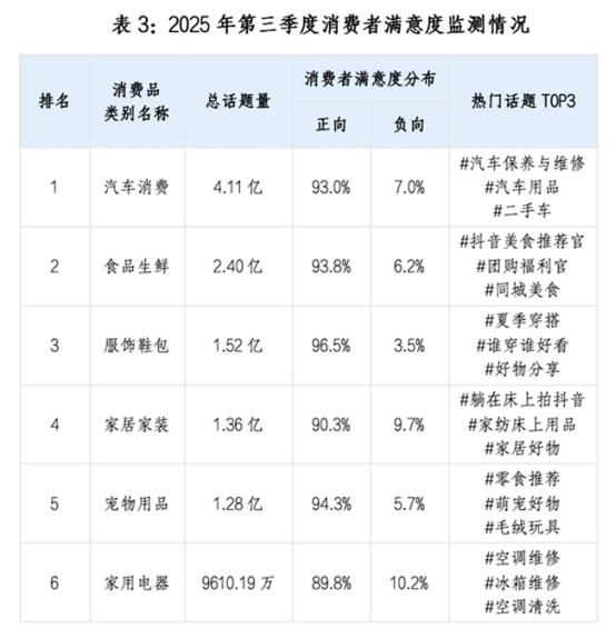 消费者满意度方面,汽车消费、食品生鲜、服饰鞋包等品类正向情绪占比高位稳定。