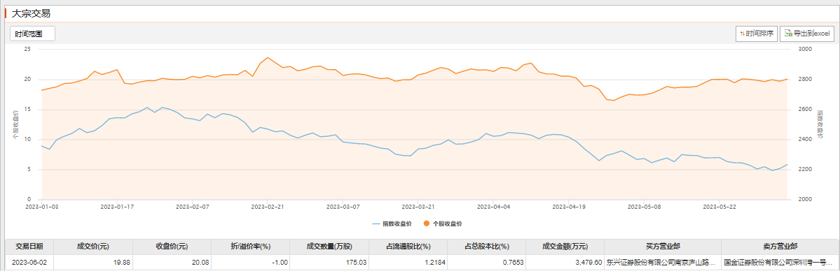 6月2日大宗交易成交175.03万股,成交额3479.6万元,占当日总成交额的46.11%,成交价19.88元,较市场收盘价20.08元折价1.0%。