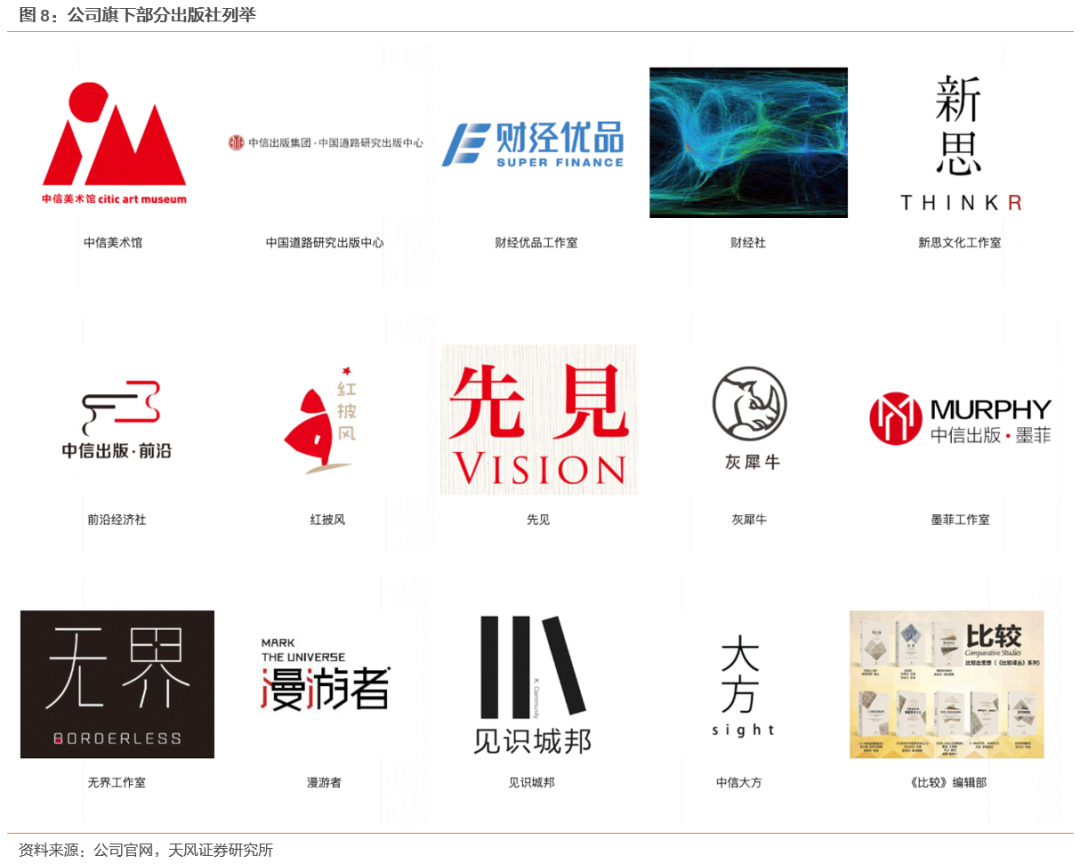 总实力突出:根据开卷报告,公司零售市场市占率常年靠前,其中24-25H1均位列全国图书零售市场单体出版社首位。旗下拥有见识城邦、前沿、灰犀牛、中信大方等知名出版社/品牌,曾与超13,000位国内外作者建立合作,出版图书超过12,000种,基本实现了大众出版领域的全覆盖,曾出版了《谁动了我的奶酪》、《从优秀到卓越》、《激荡三十年》、《黑天鹅》、《人类简史》等经典书籍。