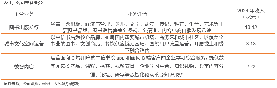 中信出版成立于1988年,隶属于中国中信集团有限公司,拥有图书、报刊、电子、音像和网络出版及批发零售全牌照,是国内首批一级出版社和全国百佳图书出版单位。业务结构看,目前公司主营1)图书出版与发行:核心主业,25H1收入占比~79%,涵盖主题出版、经管、少儿、文学、动漫等主要图书品类;2)数智服务:25H1收入占比~12%,运营面向C端用户的中信书院APP和面向B端客户的企业学习综合服务,提供数字阅读类产品等数智化驱动的泛知识服务;3)城市文化空间运营:25H1收入占比~19%,以中信书店为核心品牌,布局国内重要城市机场、商务区和城市社区,以覆盖全书业的图书、文创商品、餐饮供应链为基础,围绕用户流量运营,开展线上和线下融合销售。