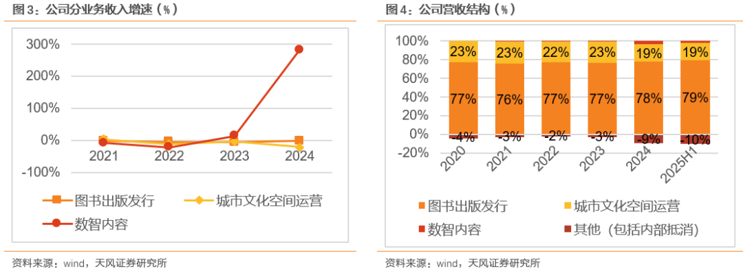 营收结构:图书出版发行为核心主业,积极探索新业务增量。以25H1营收占比口径观测,1)图书出版发行业务占比达79%,近五年来都稳定占比超75%,是公司核心主业;2)新业务:城市文化空间运营(书店业务)占比~19%、数智内容占比~12%,其中空间运营业务受疫情冲击+弱宏观等影响近年来占比略下降,数智内容业务快速增长。