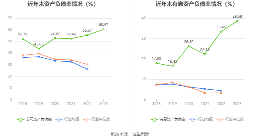 在偿债能力方面,公司2023年年末资产负债率为60.47%,相比上年末上升4.90个百分点;有息资产负债率为38.68%,相比上年末上升5.23个百分点。