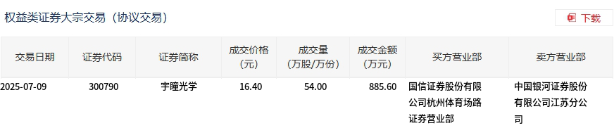 宇瞳光学今日大宗交易折价成交54万股,成交额885.6万元