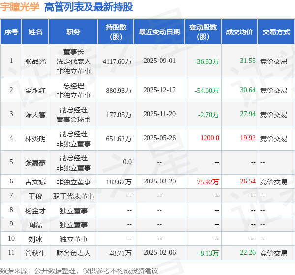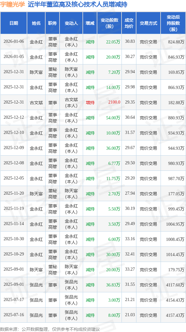 宇瞳光学近半年内的董监高及核心技术人员增减持详情如下: