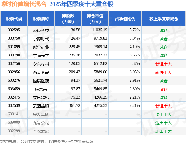 根据2025基金年报公募基金重仓股数据,重仓该股的公募基金共18家,其中持有数量最多的公募基金为博时基金的博时价值增长混合。博时价值增长混合目前规模为19.3亿元,最新净值1.283(3月19日),较上一交易日下跌2.66%,近一年上涨24.68%。该公募基金现任基金经理为王凌霄 曾豪。曾豪在任的基金产品包括:博时价值增长贰号混合,管理时间为2022年7月6日至今,期间收益率为11.78%;博时均衡优选混合A,管理时间为2023年3月7日至今,期间收益率为24.56%;博时成长精选混合A,管理时间为2024年9月24日至今,期间收益率为54.92%。王凌霄在任的基金产品包括:博时价值增长贰号混合,管理时间为2022年4月6日至今,期间收益率为16.7%;博时成长精选混合A,管理时间为2023年10月17日至今,期间收益率为71.38%。