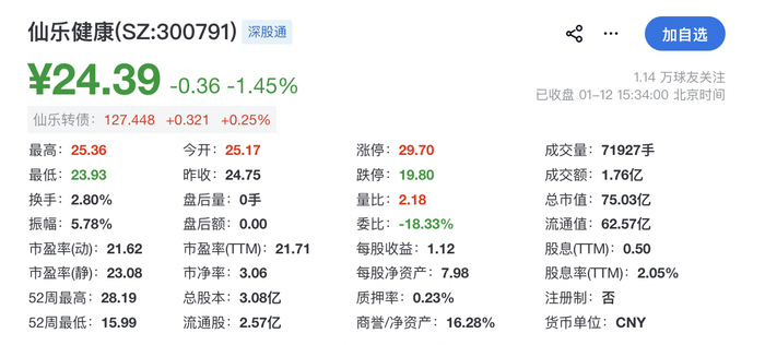 仙乐健康于2019年在深交所上市。截至2026年1月12日,其报24.39元/股,总市值75.03亿元。