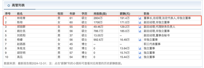 2024年,林培青薪酬为191.4万元,陈琼薪酬为171万元。