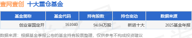 根据2025基金年报公募基金重仓股数据,重仓该股的公募基金共1家,其中持有数量最多的公募基金为富国基金的创业富国定开。创业富国定开目前规模为12.67亿元,最新净值1.9374(2月10日),较上一交易日下跌0.07%,近一年上涨61.3%。该公募基金现任基金经理为曹晋。曹晋在任的基金产品包括:富国中小盘精选混合A,管理时间为2015年1月23日至今,期间收益率为447.0%;富国通胀通缩主题轮动混合A,管理时间为2019年2月1日至今,期间收益率为410.15%;富国成长动力混合A,管理时间为2020年9月17日至今,期间收益率为58.43%。