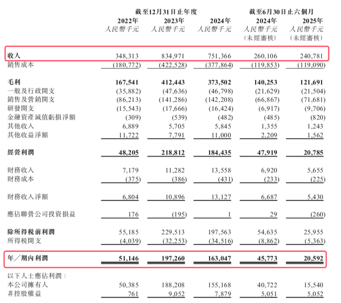 业绩方面,2022至2024年度及2025年上半年,公司收入分别约为3.48亿元、8.35亿元、7.51亿元、2.41亿元;利润分别约为5114.6万元、1.97亿元、1.63亿元、2059.2万元。毛利率分别为48.1%、49.4%、49.7%及50.5%。