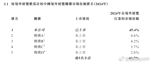 根据弗若斯特沙利文的资料,按2024年举办的境外自办展览数量及面积计,公司在所有中国的境外展览机构中名列第一。