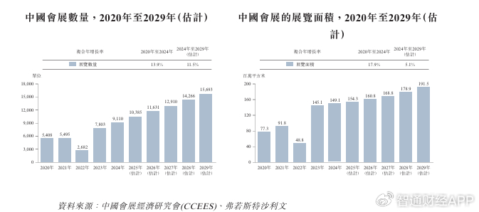 2020年至2024年,中国会展行业在展览数量及面积方面均录得显著复苏。展览数量由2020年的5,408场增至2024年的9,110场。展望2024年至2029年,预计展览数量将于2025年达10,385场,并于2029年进一步增至15,693场,预测期内的复合年增长率为11.5%。