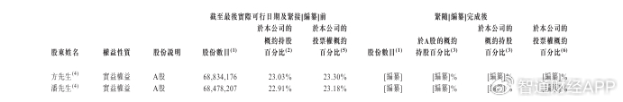 截至2025年12月14日,公司执行董事兼总经理方先生直接拥有合共68,834,176股A股权益,占公司投票权的23.30%。潘先生持有公司22.91%的股份。