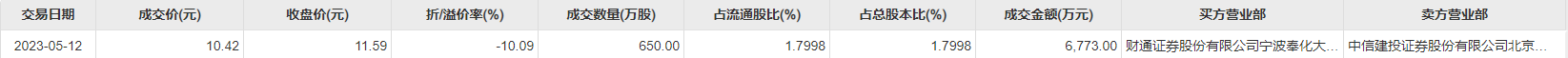 5月12日大宗交易成交650万股,成交额6773万元,占当日总成交额的64.49%,成交价10.42元,较市场收盘价11.59元折价10.09%。