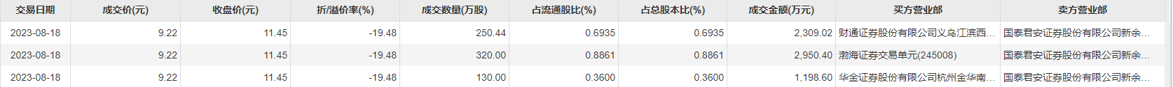 今日大宗交易成交700.44万股,成交额6458.02万元,占当日总成交额的43.42%,成交价9.22元,较市场收盘价折价19.48%。