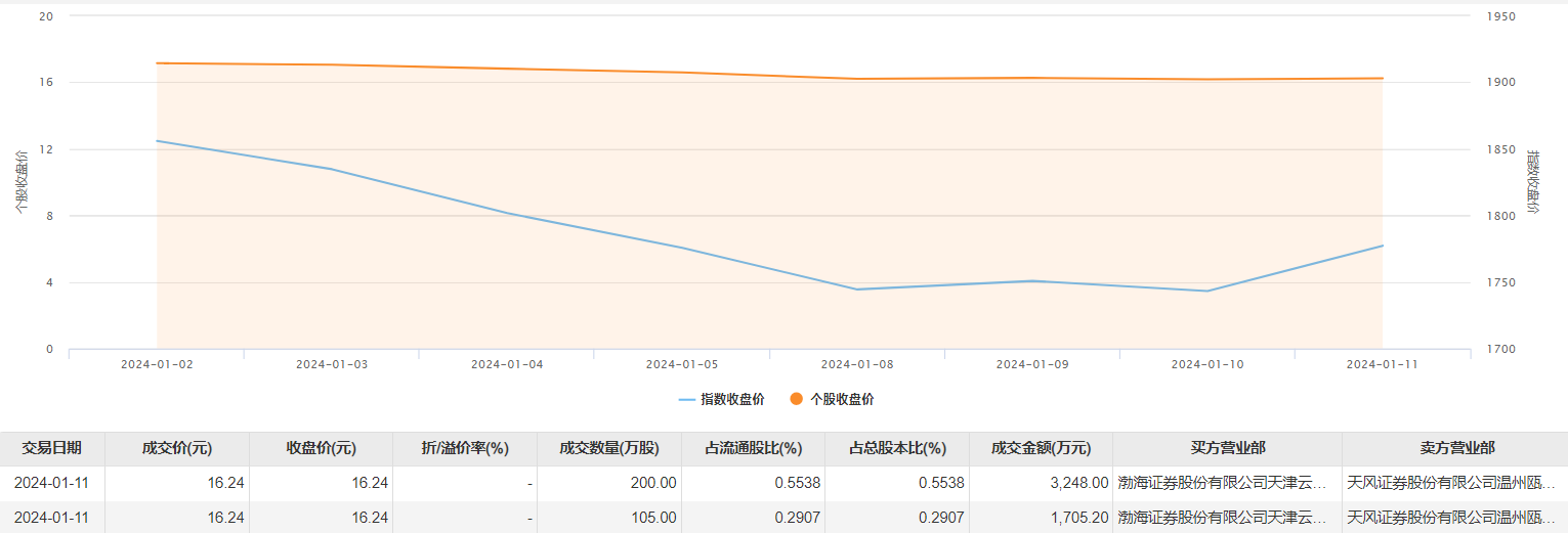 1月11日大宗交易成交305万股,成交额4953.2万元,占当日总成交额的40.4%,成交价16.24元,较市场收盘价持平。