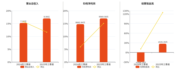 公司营业总收入为8.06亿元,较去年同报告期营业总收入增加8401.58万元,实现5年连续上涨,同比较去年同期上涨11.64%。归母净利润为9969.58万元,较去年同报告期归母净利润增加1306.75万元,实现5年连续上涨,同比较去年同期上涨15.08%。经营活动现金净流入为1535.35万元,较去年同报告期经营活动现金净流入增加7799.54万元,实现2年连续上涨。