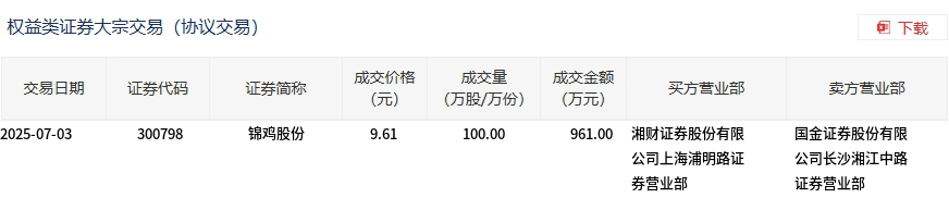 锦鸡股份今日大宗交易折价成交100万股,成交额961万元