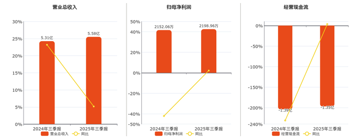 公司营业总收入为5.58亿元。归母净利润为2198.96万元。经营活动现金净流入为-1.35亿元。