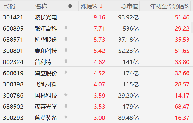 格隆汇8月5日|A股市场光刻胶概念股上涨,其中,波长光电涨超9%,张江高科涨超7%,杭华股份、泰和科技涨超5%,普利特(维权)、海立股份、飞凯材料(维权)涨超4%,国林科技、茂莱光学、蓝英装备涨超3%。