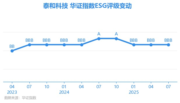日前,华证指数公布了新一期(2025年7月31日)的ESG评级结果,泰和科技(300801.SZ)获得BBB评级(华证指数评级为C起至AAA九档,C为最低档,AAA为其最高一级评级/AA为其第二档),上一期(2025年4月30日)ESG评级为BBB。本期ESG评级在462家化学制品行业A股上市公司中排名第84(上一期排名第85)。