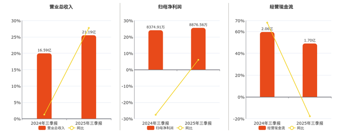 公司营业总收入为21.19亿元。归母净利润为8876.56万元。经营活动现金净流入为1.70亿元,较去年同报告期经营活动现金净流入减少3664.48万元,同比较去年同期下降17.77%。