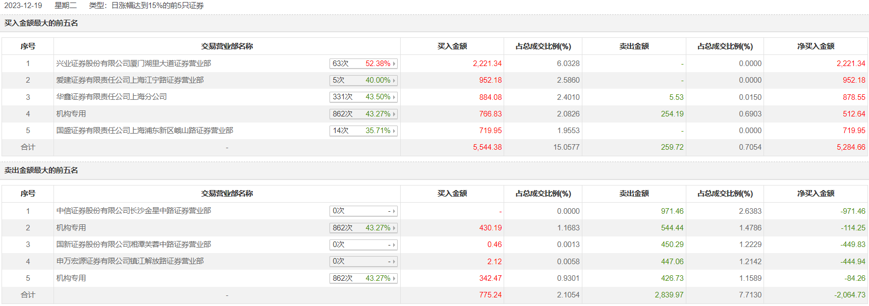 电声股份12月19日涨停,全天换手率达10.79%,振幅达23.14%。龙虎榜数据显示,营业部席位合计净买入3219.93万元。其中,机构买入1539.49万元,卖出1225.35万元,合计净买入314.13万元。此外,兴业证券厦门湖里大道证券营业部、爱建证券上海江宁路证券营业部分别买入2221.34万元、952.18万元;中信证券长沙金星中路证券营业部、国新证券湘潭芙蓉中路证券营业部分别卖出971.46万元、450.29万元。