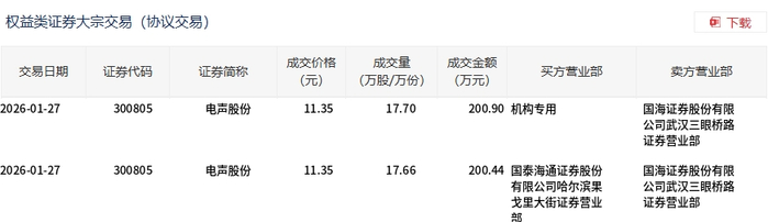电声股份今日大宗交易折价成交35.36万股,成交额401.34万元