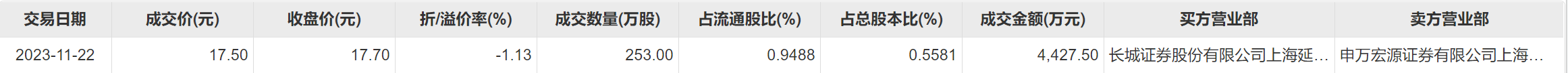今日大宗交易成交253万股,成交额4427.5万元,占当日总成交额的27.48%,成交价17.5元,较市场收盘价折价1.13%。