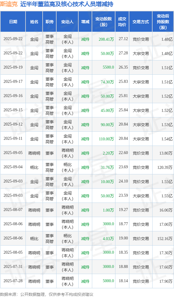 斯迪克近半年内的董监高及核心技术人员增减持详情如下: