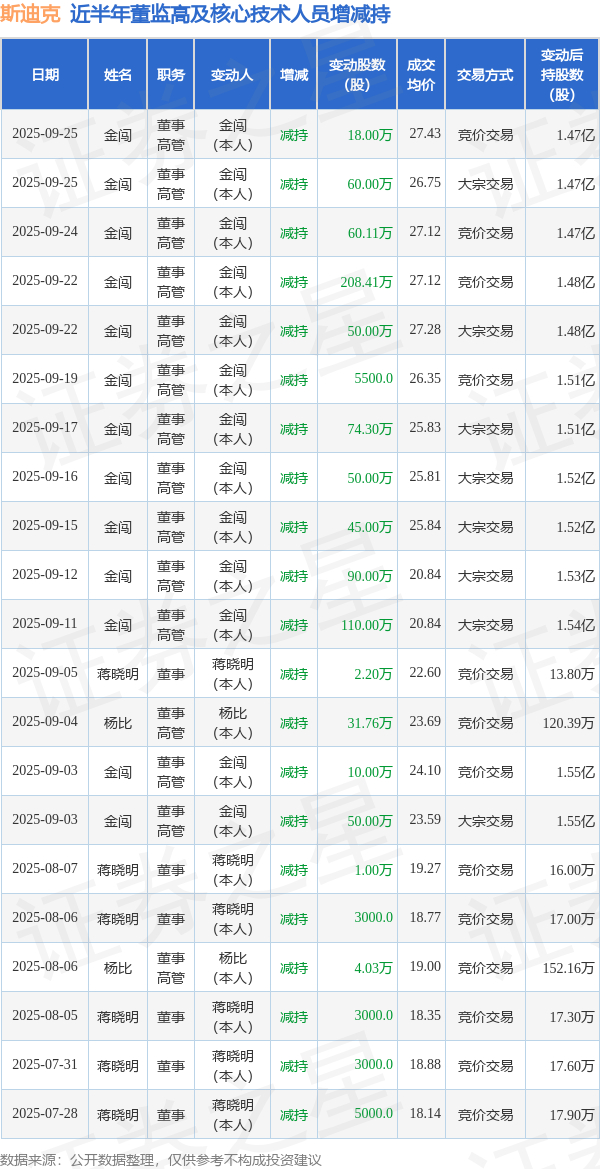 斯迪克近半年内的董监高及核心技术人员增减持详情如下: