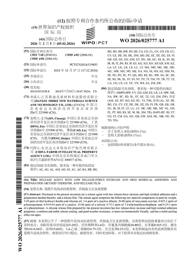 斯迪克公布国际专利申请:“低爬升高残余的离型剂、其制备方法及离型膜”