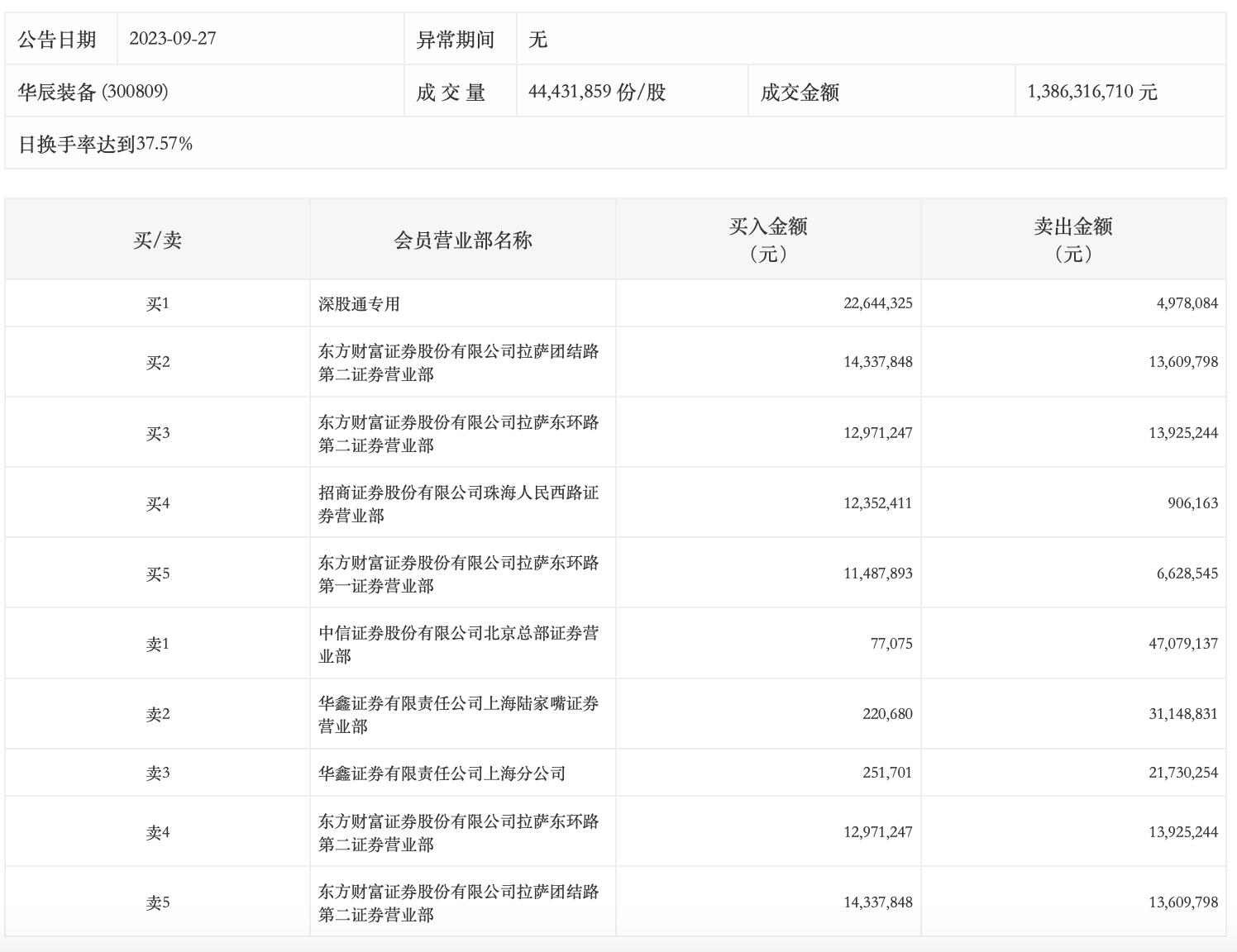 9月27日,华辰装备今日涨10.47%,全天换手率达37.57%,振幅达15.05%。龙虎榜数据显示,营业部席位合计净卖出6566.29万元。其中,深股通专用、东方财富证券拉萨团结路第二证券营业部分别买入2264.43万元、1433.78万元;中信证券北京总部证券营业部、华鑫证券上海陆家嘴证券营业部分别卖出4707.91万元、3114.88万元。