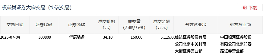 华辰装备今日大宗交易折价成交150万股,成交额5115万元