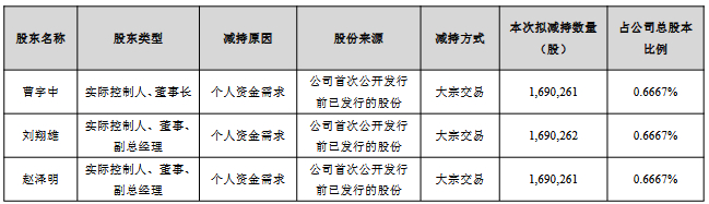 根据公告,合计持有公司股份134,811,328股(占公司总股本比例53.16%)的实际控制人曹宇中、刘翔雄、赵泽明计划在公告发布之日起15个交易日后的3个月内,以大宗交易方式减持公司股份累计不超过5,070,784股,合计占公司总股本比例2%。其中,曹宇中拟减持1,690,261股,占公司总股本比例0.6667%;刘翔雄拟减持1,690,262股,占公司总股本比例0.6667%;赵泽明拟减持1,690,261股,占公司总股本比例0.6667%。
