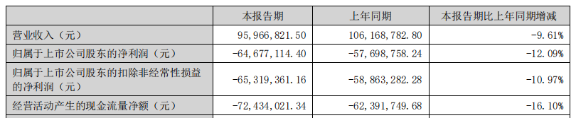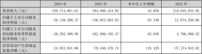 2024年,公司实现营业收入2.40亿元,同比增长45.65%;归属于上市公司股东的净利润-2613.83万元,上年同期为-1.57亿元;归属于上市公司股东的扣除非经常性损益的净利润-2828.34万元,上年同期为-1.63亿元;经营活动产生的现金流量净额2495.38万元,上年同期为-7044.65万元。