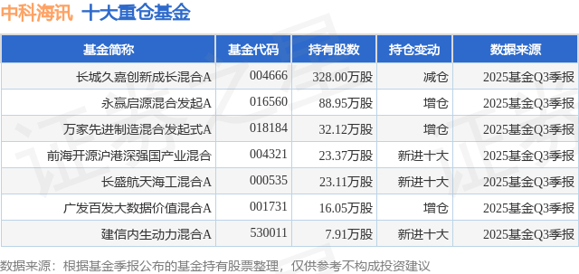根据2025基金Q3季报公募基金重仓股数据,重仓该股的公募基金共7家,其中持有数量最多的公募基金为长城基金的长城久嘉创新成长混合A。长城久嘉创新成长混合A目前规模为19.74亿元,最新净值3.5064(1月9日),较上一交易日上涨3.36%,近一年上涨116.15%。该公募基金现任基金经理为尤国梁。尤国梁在任的基金产品包括:长城景气成长混合A,管理时间为2023年9月12日至今,期间收益率为67.59%。