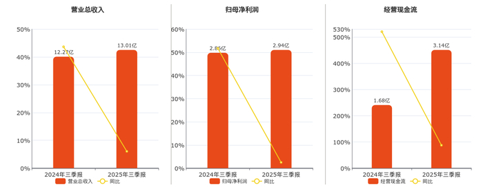公司营业总收入为13.01亿元。归母净利润为2.94亿元。经营活动现金净流入为3.14亿元。