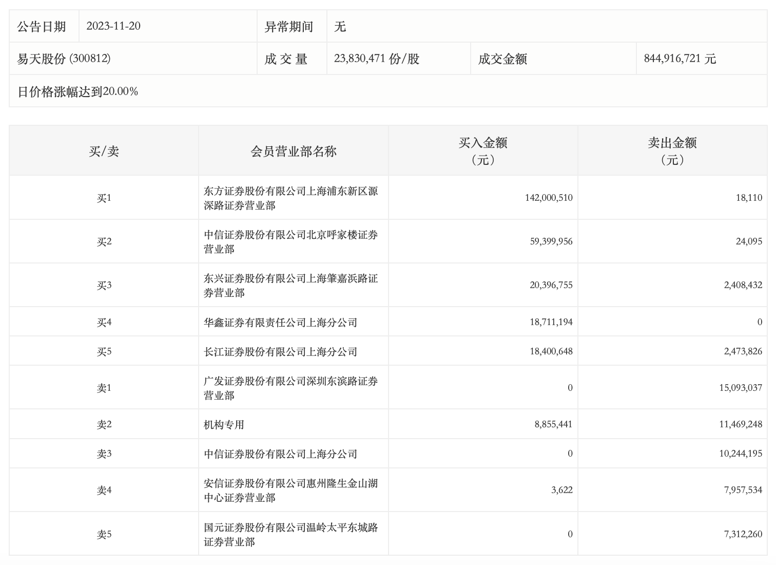 11月20日,易天股份今日涨停,全天换手率达26.52%,振幅达13.95%。龙虎榜数据显示,营业部席位合计净买入2.11亿元。其中,机构买入885.54万元,卖出1146.92万元,合计净卖出261.38万元。此外,东方证券上海浦东新区源深路证券营业部、中信证券北京呼家楼证券营业部分别买入1.42亿元、5940.00万元;广发证券深圳东滨路证券营业部、中信证券上海分公司分别卖出1509.30万元、1024.42万元。