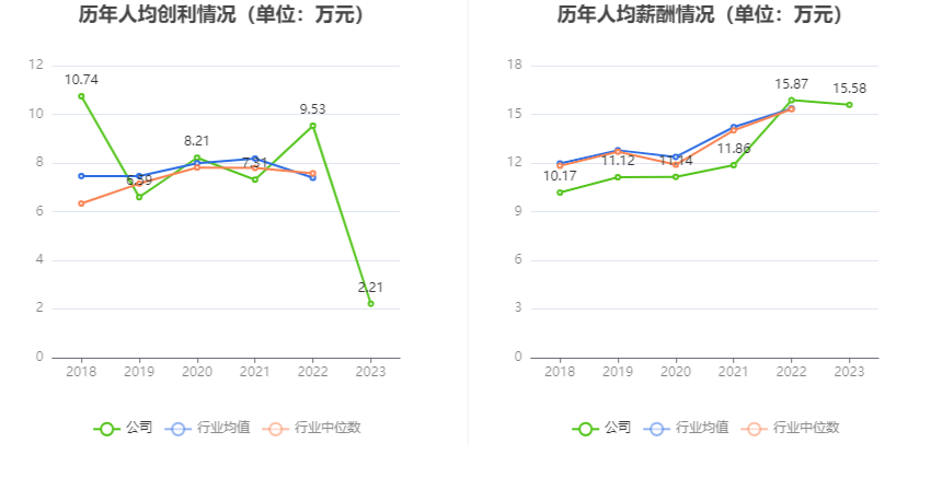 截至2023年末,公司员工总数为888人,人均创收30.39万元,人均创利2.21万元,人均薪酬15.58万元,较上年同期分别下降32.05%、76.76%、1.84%。