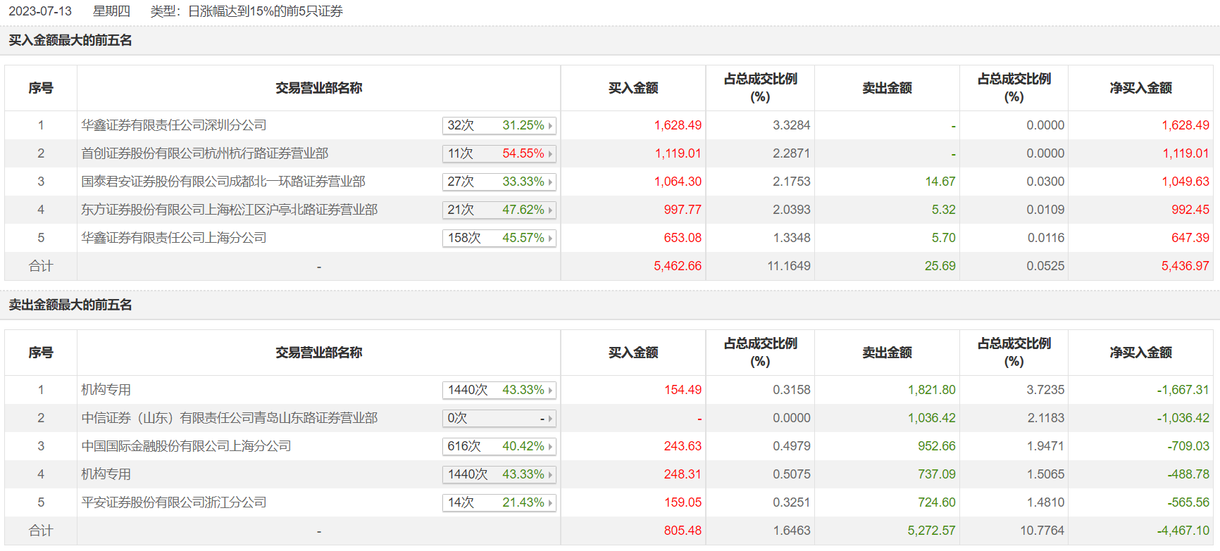 中富电路7月13日涨停,龙虎榜数据显示,上榜营业部席位全天成交1.16亿元,占当日总成交金额比例为23.64%。其中,买入金额为6268.14万元,卖出金额为5298.27万元,合计净买入969.87万元。