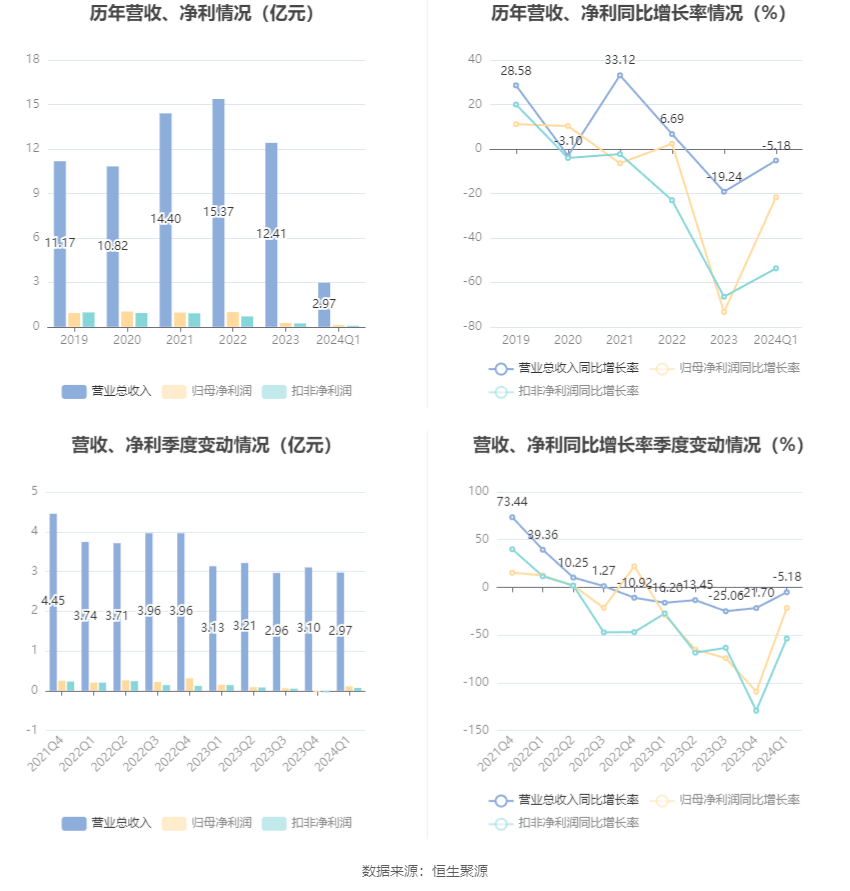2024年第一季度,公司经营活动现金流净额为2516.74万元,同比下降40.81%;筹资活动现金流净额-2341.17万元,同比减少3859.78万元;投资活动现金流净额-736.46万元,上年同期为-1652.89万元。