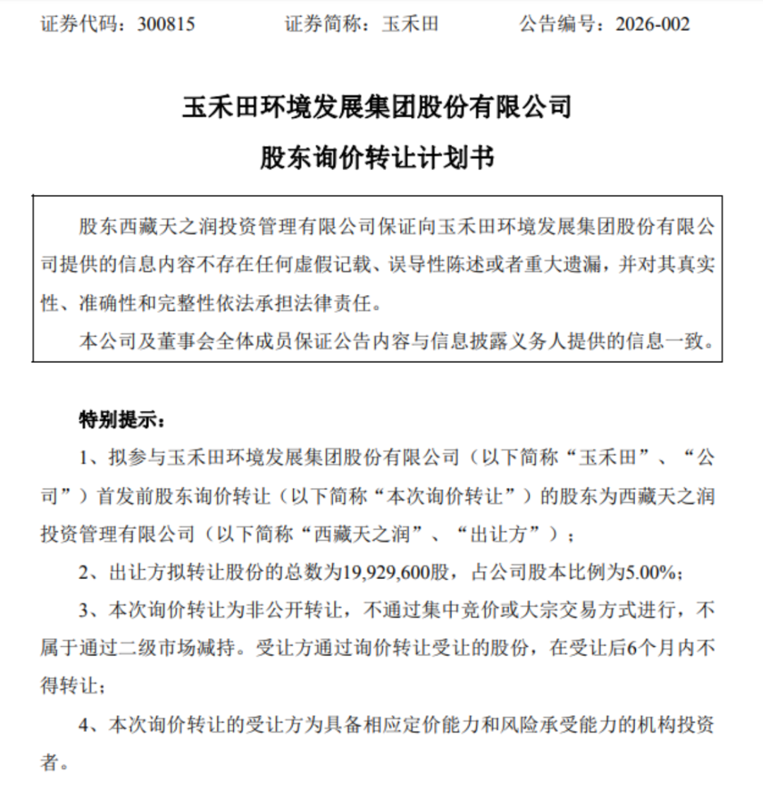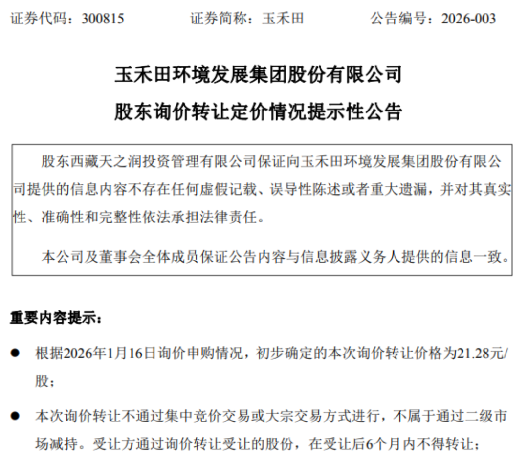 玉禾田1月15日曾发布股东询价转让计划书,其股东西藏天之润投资管理有限公司拟询价转让股份数量19,929,600股,占公司股本比例的5.00%,转让原因为自身资金需求。经向机构投资者询价后,初步确定的转让价格为21.28元/股。