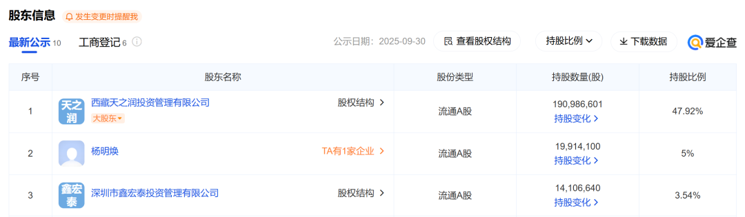 据第三方平台公开股权信息可知,截至转让计划披露日,玉禾田股份总数为398,592,000股。本次询价转让前,西藏天之润持有玉禾田股份比例为47.92%,根据《上市公司收购管理办法》规定,其一致行动人深圳市鑫宏泰投资管理有限公司、周聪分别持有玉禾田股份比例为3.54%、0.27%,西藏天之润及其一致行动人合计持有玉禾田股份比例为51.73%。