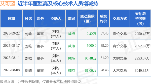 艾可蓝:9月22日高管刘屹减持股份合计2.42万股