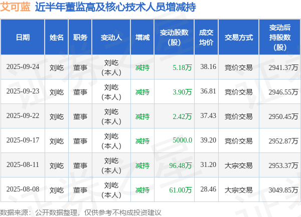 艾可蓝:9月24日高管刘屹减持股份合计5.18万股
