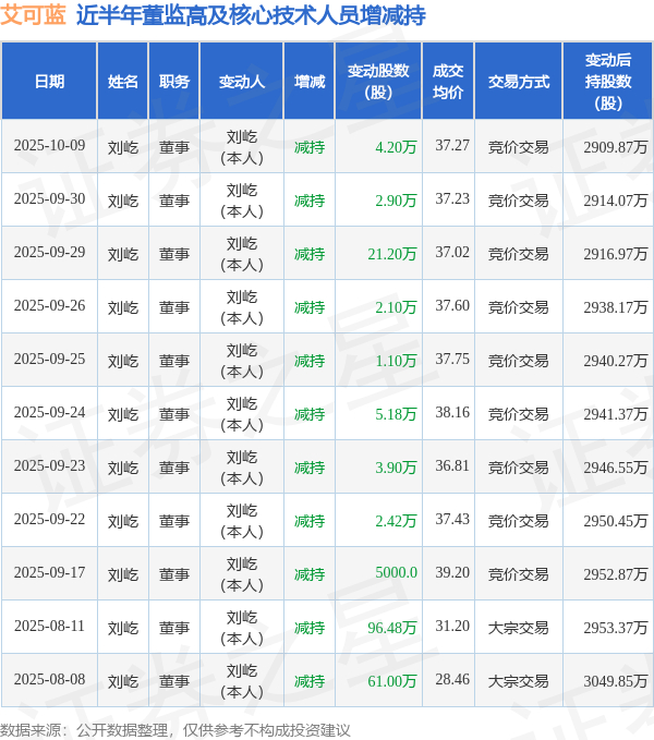 艾可蓝:10月9日高管刘屹减持股份合计4.2万股