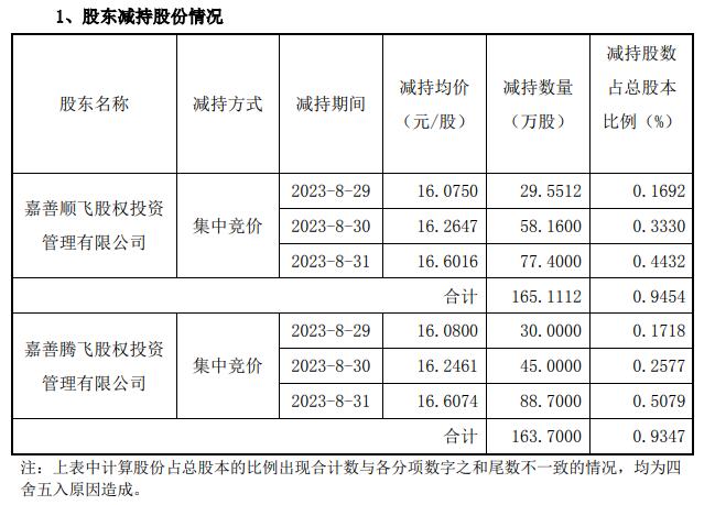 公告显示,2023年8月29日、30日、31日,顺飞投资共计减持所持有双飞股份1,651,112股,占公司总股本比例0.9454%。2023年8月29日、30日、31日,腾飞投资共计减持所持有双飞股份1,637,000股,占公司总股本比例0.9347%。